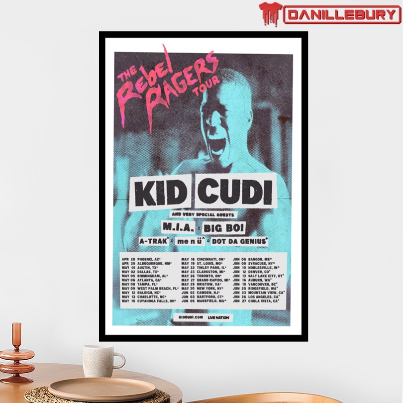 rebel ragers tour poster, kid cudi 2026 tour, limited edition concert poster, music memorabilia collector, kid cudi fan merchandise, vibrant tour poster, rebellious spirit decor, exclusive music poster, bold graphic design, room decor inspiration, music studio wall art, concert memorabilia collection, kid cudi fan gift, iconic concert poster, music tour merchandise, collectible music artwork, fan memorabilia item, tour memorabilia keepsake, unique music poster design