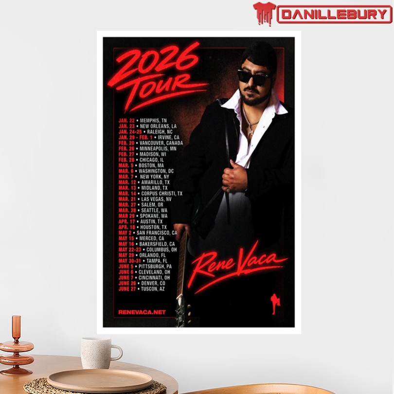 Rene Vaca tour poster, limited edition, music history collectible, 2026 concert memorabilia, vibrant design, artistic flair, high-quality print, music enthusiast gift, collectible poster art, musician merchandise, live performance art, music lover decor, tour memorabilia item, limited edition poster, music artist merchandise, concert tour collectible, music fan gift, exclusive tour poster, collectible music souvenir.
