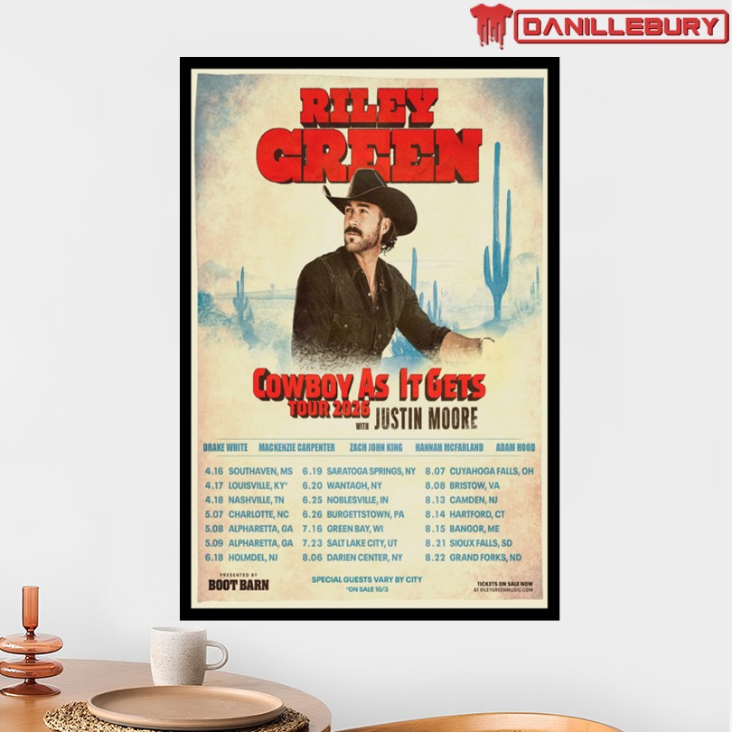 Riley Green Cowboy As It Gets Tour 2025 Poster, Riley Green concert poster, Cowboy As It Gets Tour poster, Riley Green tour memorabilia, Country music poster, Western-themed concert poster, Riley Green fan collectible, Music tour merchandise, Riley Green memorabilia, Country music decor, Concert tour poster, Riley Green merchandise, Western style poster, Country music fan gift, Riley Green tour merchandise, Limited edition concert poster, Riley Green collectible poster, Exclusive tour memorabilia, Riley Green fan merchandise